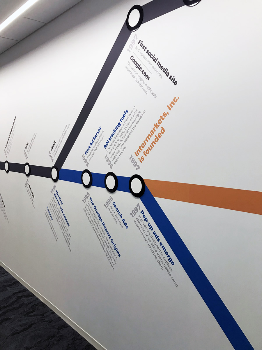 When Intermarkets Inc. decided to move to a new location, I was tasked with creating a timeline of the history of the internet, including online advertising, and company history. Inspired by the Washington D.C. Metro map, the timeline was printed on vinyl spanning three separate walls.